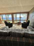 The waterfront provides an ideal location to enjoy the sights and sounds of waves crashing against the rocky shoreline. A large deck houses a 10-foot picnic table and umbrella for guests to enjoy outdoor meals. From the picnic deck, a path leads to the waterfront where you can access two docks and a mooring. The waterfront area is rocky, with scattered boulders, providing an ideal location to enjoy the sights and sounds of waves crashing against the rocks. The spacious home includes 5 bedrooms and 2 bathrooms, perfect for multiple families. Two bedrooms are located on the first floor and three bedrooms are located on the second floor, including a bunk room for kids or adults.