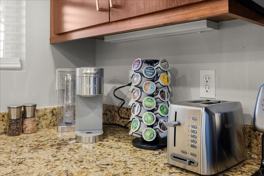 The kitchen is fully stocked and equipped with stainless steel appliances such as a microwave, fridge, stove, and dishwasher, along with glasses, mugs, dishes, and cutlery. This home also features an in-house washer and dryer and a smart TV in the living room.
