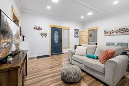 Creekside Cabin boasts access to Beaver Lake with a creek just across the street and provides 2 kayaks for guest use. The game room features a Wii gaming console and plenty of board games, while the fully fenced backyard offers seating for relaxation. The living room includes a large Smart TV with streaming channels, plush seating, and a dining table for 6. The kitchen is fully stocked with a large island and bar stools, and the game room offers additional seating, a coffee bar, and another Smart TV.