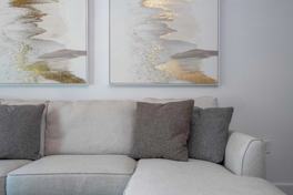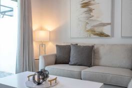 The open-concept living area features a large smart TV. The fully equipped kitchen features sleek countertops, a large refrigerator, dishwasher, and stainless-steel appliances. There are four immaculate bathrooms.