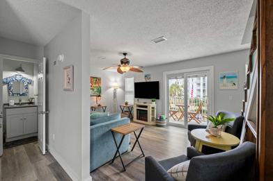 This quaint townhome has a classic coastal charm, perfect for soaking up the sun and sand. The kitchen is equipped with full appliances, dishes, bake ware, pots and pans, silverware, utensils, a crockpot, a blender, a traditional coffee maker and a Keurig. A high chair, pack and play, kids cutlery, cups, and plastic dishes are available for tiny travelers. The living room has a queen sleeper sofa and a large flat screen TV with standard cable. In the cooler months, guests can enjoy the electric fireplace. Beach towels are provided for guest use during your stay, and a full-size washer and dryer are in the garage.