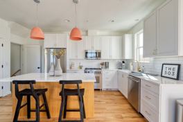 The open-concept living area features a chef’s kitchen with top-of-the-line appliances, quartz countertops, and ample cabinet space. Enjoy the stylish dining area and cozy living room with a large flat-screen TV and comfortable seating for relaxation. The townhome includes three spacious bedrooms with plush bedding and natural light, along with a shared, well-appointed full bathroom providing privacy and convenience for all guests. Additionally, there is a private gym equipped with cardio, strength training, and yoga equipment.