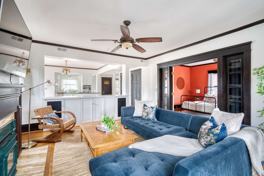 This apartment features a spacious living room with a smart TV and vintage fireplace mantle, a fully equipped kitchen with a Keurig and cookware, and a formal dining area with bay windows. Enjoy premium linens, plush queen mattresses, historic trim, original windows, and period details. There is also an in-unit washer and dryer for your convenience.