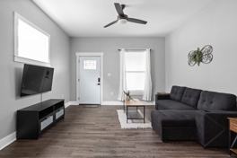 This modern 2-bedroom home is perfect for up to 5 guests and features a fully equipped kitchen with a coffee bar, in-unit laundry, a full bath, and an extra half bath. Relax on the comfy couch and stream your favorite shows on the smart TV. Two cozy bedrooms come with premium linens and sound machines to help you sleep peacefully. Enjoy meals in the spacious dining area or relax in the open backyard.