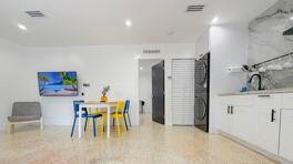 This modern Miami retreat features a queen-size bed, two twin beds (convertible to queen), and a comfy sofa bed, sleeping up to five guests. The elegant bathroom includes a walk-in shower and soft towels. Lounge in the bright living area with a smart TV and cozy seating. The fully equipped modern kitchen includes a fridge, stove, microwave, and cookware. Enjoy access to the heated saltwater pool, outdoor shower, and sun loungers.