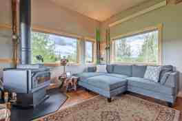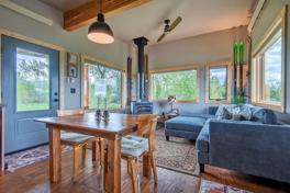 If you're searching for the ultimate retreat to unplug and unwind, this charming 1-bedroom cabin off Ski Hill Road is your ideal getaway in Teton Valley. Escape the distractions of daily life as this cozy cabin offers no TV, allowing you to fully embrace the serene beauty around you. Step into a bright, open living space where windows on all sides frame stunning views of the natural surroundings. The kitchen and living room blend seamlessly, creating a space filled with natural light and offering a calming connection to the outdoors. A sleek, modern bathroom separates the living area from the cozy bedroom. In the living room, you’ll find tasteful mid-century modern accents, while the bedroom is adorned with repurposed 100-year-old cabinets for a touch of rustic charm. The eastern porch offers a unique experience—a vintage Thunder chairlift (#108) sits proudly, providing a perfect spot to take in views of Grand Targhee and the towering Grand Teton in the distance. Crafted with locally sourced Douglas fir wood siding, this cabin beautifully combines rustic character with thoughtful design, creating a warm and inviting atmosphere.