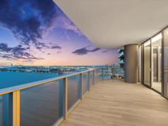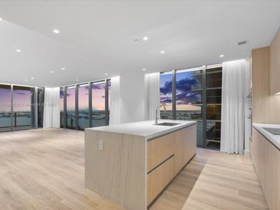 2,500+ SF corner residence includes 2 assigned parking spots and features a private elevator foyer, 4 bedrooms, 5.5 baths + den, oak-style tile, chef’s kitchen w/ Thermador appliances & waterfall island, illuminated primary closet, recessed drop ceilings, and electric curtains with blackouts. A 298 SF terrace frames panoramic views of Miami's most iconic landscape.