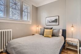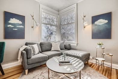 This charming apartment is one of four in a beautifully converted mansion 4-plex, common in Denver's older neighborhoods. It blends old-school charm with hardwood floors, a red brick exterior, and broad windows, alongside a modern style with a renovated kitchen and bath and hip furniture. Located on the second floor at the front of the building, the living room and bedroom windows open to a tree-lined neighborhood street, and a lovely balcony offers a perfect spot for coffee, reading, or dining al fresco.