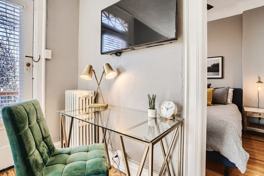 The apartment features a renovated kitchen and bath, complemented by hip furniture that adds a modern touch to the classic charm of the space.