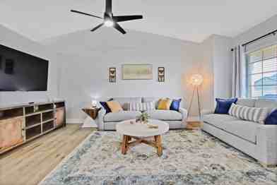 This newly renovated home features 3 bedrooms and 2 bathrooms, offering a tranquil retreat in the Nampa/Boise area. Professionally furnished and decorated, the living room, kitchen, and dining area provide a welcoming space for relaxation. The master bedroom includes an en-suite bathroom and a walk-in closet, ensuring comfort and convenience.