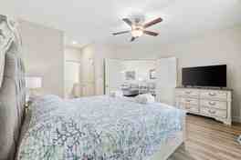 The fully stocked kitchen, with beautiful granite tops and brand new, modern appliances, opens to the living area with seating for five and dining with seating for six. Relax on the fully screened patio with seating for five. The primary suite offers impressive space and is equipped with a king-size bed, a large closet, a 50" Roku TV, and an en suite bath. Beach chairs and an umbrella are available in the 3-D lockable storage closet across the hallway from the front door.