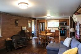 This cabin retains its cozy log cabin ambiance while featuring modern upgrades. Recently renovated, it boasts high-end finishes such as barn-wood accents, granite countertops, and historical art celebrating the pioneering spirit of the West. The fully equipped kitchen, with stainless steel appliances and granite countertops, is perfect for culinary adventures. The dining area seats four, offering a scenic spot to share meals. The living room, with a plush couch and a chaise lounge that converts into a sleeper trundle, is ideal for relaxing and enjoying views or winding down with a movie on the large flat-screen smart TV. The bedroom features a comfortable queen bed and an en-suite bathroom with a tub and shower combination. Convenient amenities like a stacked washer and dryer make stays both comfortable and practical. Stay connected with Wi-Fi and enjoy access to streaming services, or unplug with a selection of board and card games.