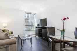 Inside, the apartment blends comfort and class with an elegant attended lobby finished with porcelain tile floors, natural white-oak wood panels, and Italian marble highlights. The interior courtyard, with lush plantings and greenery, offers a serene view, while the Linea Terrace provides multiple areas for entertaining and enjoying the city lights. The unit features in-unit laundry, a modern chef’s kitchen with ample storage, and a beautiful bathroom with a soaking tub.