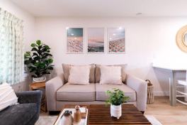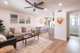 Located up a short flight of stairs on the second floor of our 8-unit "aparthotel," this unit includes one king bedroom, one queen bedroom, a sofa bed, and a sleek bathroom with a walk-in shower. Each bedroom provides ample closet space to stow your belongings, while the bathroom includes a vanity with extra storage space in the closet adjacent to the door. The common areas offer plenty of sunlight, highlighting beautiful features like romantic decor, open concept design, and brand new furniture and appliances, including a dishwasher. In the lounge area, you'll find a wide couch to kick back and stream your favorite show on the Smart TV, while the inviting kitchen is fully stocked, with bar-style seating for four. This unit is an ideal escape and landing pad to take advantage of all the area has to offer.