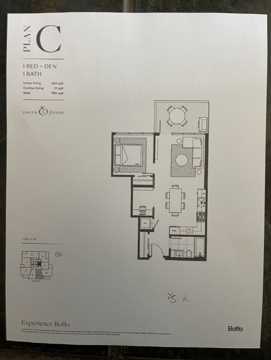 - 1 Br + Den (Doored) Unit of 544 SF Living space + Large Balcony (111 SF)