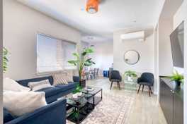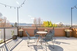 This third-story walk-up combines sleek modern living with artistic Portland flair. The exterior’s rusted metal, painted stucco, and Shou Sugi Ban siding make a bold first impression, while inside, clean design and natural light set a calming tone. The apartment includes three queen bedrooms with plush bedding, blackout shades, and quiet comfort, and a bunk room with twin beds perfect for kids or extra guests. The living room features a Smart TV with streaming, mid-century touches, oversized windows, and 9-ft ceilings for an airy vibe. The kitchen and dining area boast stainless steel appliances, a dishwasher, a Keurig, a full cookware set, quartz countertops, and a full dining set-up for meals in or takeout from Hawthorne’s best spots. The two modern full baths come with tub/shower set-ups, stocked with shampoo, a hairdryer, and fresh towels. The rooftop deck offers incredible city views, bistro seating, and twinkling string lights—ideal for morning coffee or evening wine. Extras include mini-split A/C and heat in every room, an in-unit washer/dryer, lightning-fast Wi-Fi, streaming TV, and premium finishes throughout.
