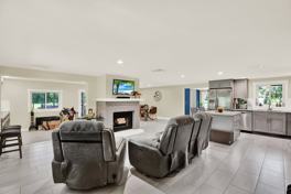 Inside, you'll find a beautifully maintained interior featuring tile floors, granite countertops throughout, stainless steel appliances, and an eat-in kitchen island with extra cabinets and a pantry. The living room offers added charm with built-in cabinets and a cozy fireplace, perfect for relaxing during the cooler months. Hurricane-rated double-pane windows throughout provide both peace of mind and energy efficiency.