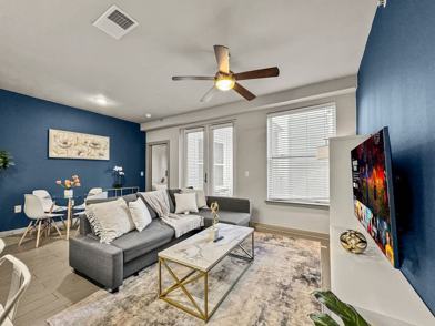 Welcome to this charming 2-bedroom, 2-bathroom apartment. This modern retreat has everything you need for a relaxing stay. The living and dining areas feature LED lighting and stylish furniture. The bedroom offers a peaceful escape with stunning night views and plenty of natural light through large windows, complemented by warm wooden floors. The living room includes a sofa bed and chair with a coffee table and a 55” 4K HDR Smart TV with Netflix. Bedroom 1 has a queen-size bed with a luxury foam mattress, a walk-in closet, and reading lamps. Bedroom 2 features two queen-size beds, a work desk, and an office chair. The bathroom includes a shower and bath, sink, mirror, and toilet, along with towels and essential toiletries. The kitchen is fully equipped with an oven, stove, refrigerator/freezer, dishwasher, and sink with hot and cold water, as well as glasses, silverware, and pots and pans. A thorough cleaning is ensured after each stay to prioritize your health and safety.