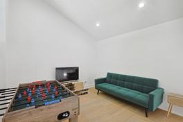 The living area features high-speed Wi-Fi and a flat-screen TV, perfect for both relaxation and remote work-friendly setups.