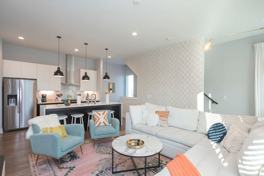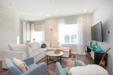 This newly furnished townhouse boasts an open and fun space, ideal for any gathering. The fully stocked kitchen includes an island with barstools and a workstation/bar with leather seats. The spacious living area features a custom mural, providing a unique backdrop for relaxation or entertainment. The rooftop deck is a highlight, perfect for watching the sunrise and sunset over the city.