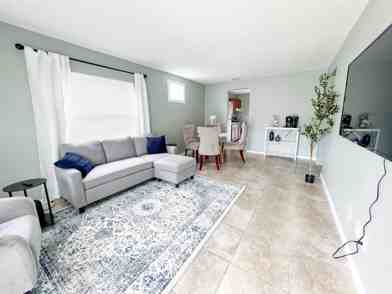 This beautifully decorated and fully furnished home is ideal for families, couples, or friends seeking a relaxing stay. Feel right at home in the lovely living room, complete with comfortable seating and a 65-inch flat-screen TV for your entertainment. The fully equipped kitchen includes a stove, refrigerator, microwave, and coffee maker, with a dining area conveniently located next to it. The two bedrooms are furnished with comfortable beds and ample closet space, while the bathroom is stocked with fresh towels and complimentary toiletries for your comfort.