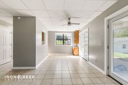 The home features tile flooring throughout and a bright, open layout enhanced by multiple glass doors that fill the space with natural light. The kitchen is outfitted with a refrigerator, dishwasher, and electric range, while a full-size washer and dryer provide in-unit laundry convenience.
