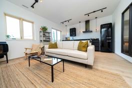 Experience luxury loft living in this stunning 2-bedroom, 2-bath suite with over 1,000 sq. ft. of interior space plus a private terrace for outdoor enjoyment. Designed with a Scandinavian aesthetic, this modern home features German-engineered wood floors, designer finishes, and a Jotul gas fireplace that anchors the open-concept living and dining area — perfect for entertaining.