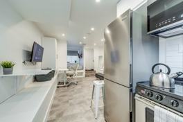 This modern studio offers premium finishes and spans over 325 sq ft on the lower level, featuring 8 ft ceilings and large windows that flood the space with natural light. Enjoy the comfort of a full-size bed with a Bloom Cloud Premium Mattress, a 3-piece bathroom with a spacious shower, and a fully equipped kitchen with a 24” range, 18” dishwasher, full-size refrigerator, and hood fan/microwave. The apartment also includes a full-size dedicated washer/dryer and ultra high-speed fibre optic internet with speeds up to 1.5gbps.