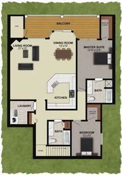 The Meadow is a very large two bedroom upper apartment. This apartment features a balcony that overlooks our beautiful landscaped grounds. The balcony is the width of the entire apartment with three full sized door walls to enter and exit from. This is our largest two bedroom apartment that has an open floor plan concept. This apartment also comes fully equipped with all the appliances, one car attached garage, personal private entrance, electric fireplace, two full size bathrooms, walk in closets, and vaulted ceilings!