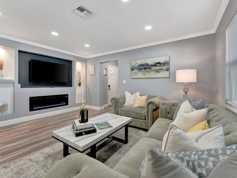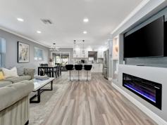 The open-concept layout features a chef's kitchen with stainless steel appliances and a cozy living room with an electric fireplace. Enjoy indoor dining or sip cocktails on the patio at sunset. The home includes smart TVs in every room, a Pack n’ Play, and a high chair. The master bedroom features an en-suite bathroom with a jacuzzi, walk-in shower, and his and hers sinks. The shared guest bath offers a tub/shower combo. A free washer and dryer are available for your convenience.