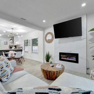 Relax, recharge, and play in this fully renovated 2-bedroom, 1-bathroom home with a private resort-style backyard featuring a hot tub, fire pit, mini-golf, yard games, grill, and more! Ideal for families, couples, or remote workers. The cozy living room includes an L-shaped sofa, smart TV, and electric fireplace. The modern kitchen is equipped with stainless steel appliances, a Keurig with free pods, a gas stove and oven, microwave, toaster, blender, and all necessary cookware and utensils. The master bedroom offers a queen bed and mounted TV, while the guest room includes a twin trundle with two twin beds. A queen air mattress is available upon request. Enjoy the stylish full bath with free shampoo, towels, and hair dryer, as well as a free washer and dryer.