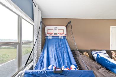 Inside, you'll find a large master room with a king-size bed, double patio doors, and blackout curtains. There are two guest rooms with queen beds and blackout curtains, and a large game room with three twin beds, a pull-out sofa bed, a queen air mattress, and a large couch. The fully equipped kitchen includes all essentials, an ice cream maker, and a griddle. The game room offers ping pong, basketball, board games, and more, while fast Starlink internet ensures connectivity.