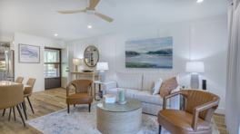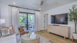 Welcome to our newly renovated 2-bedroom, 2-bathroom villa at Fiddler's Cove, located on the serene third floor. This spacious and modern apartment features a kitchen with new cabinets, quartz countertops, GE appliances, and floating shelves. Behind barn doors, you'll find the washer, dryer, and pantry. The updated bathrooms boast new vanities and tile. The dining area includes a coffee and wine bar with seating for six, while the living area offers a queen sleeper sofa, side chairs, and a 65-inch TV.