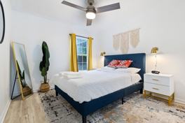This stylish space is great for workers, families, and visiting students. Step inside to a bright and welcoming living area, adorned with modern furnishings and tasteful decor for a comfortable stay. The living room is a stylish and inviting space with a cozy sofa, lounge chairs, and a large 50-inch LED 4K Smart Roku TV for you to enjoy your favorite shows and movies. The room’s fun colors pop and adds a touch of elegance to the room. Prepare delicious meals in the fully equipped chef's kitchen, complete with cook/bakeware, utensils, coffee maker, microwave, and oven. The home is a fully furnished oasis, featuring eclectic furnishings with attention to detail throughout. The plush mattresses and luxury linens ensure a restful stay.