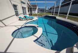 square feet of living space, with 5 bedrooms, 3 full bathrooms, and a large, enclosed lanai with a sparkling pool and jacuzzi. The 2 junior master