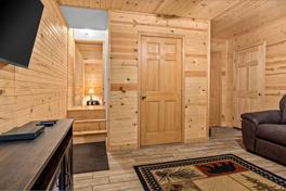 The cozy living area is ideal for relaxing with a good book or enjoying a movie night. The fully equipped kitchen and dining space make meal prep and family gatherings a breeze. Enjoy the home's zero gravity massage chair to fully unwind after a day's adventures. Step outside to discover an inviting outdoor space, complete with a 3-person hot tub, ambient lighting, and a fire pit surrounded by comfortable chairs. The cabin also boasts a game room for indoor entertainment and a convenient laundry room.