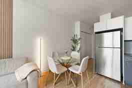 This newly constructed apartment is fully stocked and features a modern interior design, an in-unit washer and dryer, and fast Wi-Fi.