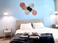 The apartment features a bright and spacious living area with ceiling fans in both the living room and bedroom, an open layout with upgraded flooring and modern tile accents, and a private balcony. The fully equipped kitchen includes energy-efficient stainless steel appliances, granite countertops, a wine fridge, refrigerator, stove, microwave, coffee maker, blender, toaster, cookware, and utensils. The spacious bedroom offers a comfortable king-size bed with premium linens and a large walk-in closet.