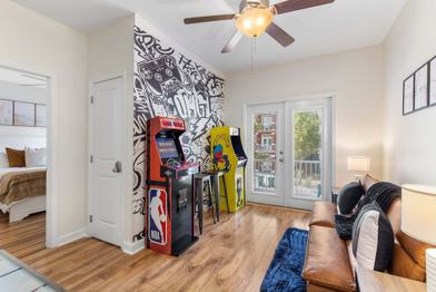 This spacious home sleeps up to 12 guests comfortably, making it perfect for family vacations, group getaways, and memory-making with friends. With a bright open floor plan, stylish bedrooms, and fun entertainment spaces, it’s the ultimate spot to relax after a day of sun and adventure. The main floor includes a King Master Suite with Smart TV, ensuite bath, and plush seating, a chef’s kitchen with high-end appliances, large island seating, and coffee bar, and a living room with a large leather sofa, Smart TV, and open flow to dining. The upper floor features a Queen Suite with ensuite bath and remote work desk, a Queen Bedroom with balcony access, a Bunk Room with 2 twin bunk beds (sleeps 4), and an arcade/game room with air hockey, arcade games, and a leather couch.