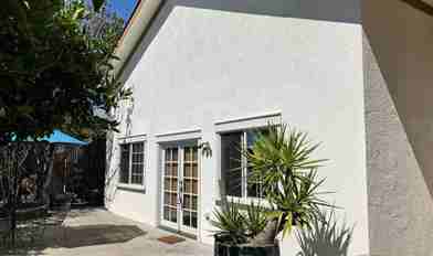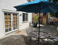 The outside area features a patio with metal table, chairs, large mature fruit trees, and a large decorative canvas umbrella. Home is part of a triplex, but detached from the other two attached units. No common wall. Rental offers one, off-street parking space and a locked gated entry.