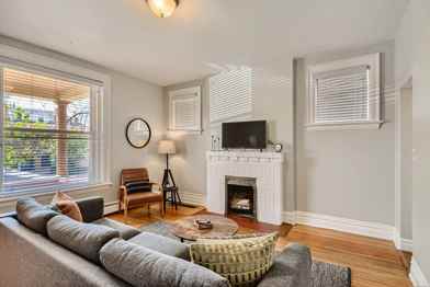 The apartment combines old-school charm with modern design, offering stylish and comfortable furniture. The renovated kitchen and bath provide a contemporary touch to this classic red brick building.