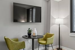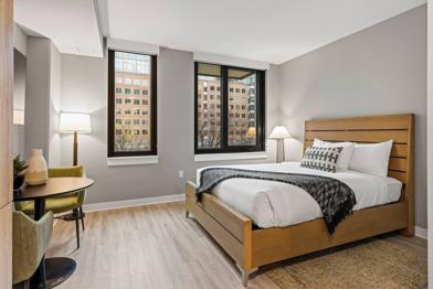 A fully loaded kitchen, in-room laundry, and a cozy queen bed make this the perfect space to stay awhile. Balconies are available in select units only, and photos may be representative.