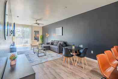 This apartment features a socially and environmentally conscious living environment with top-notch customer service and unparalleled amenities. The innovative open-concept design blends the living and dining areas with the fully equipped kitchen, creating a modern and sleek living experience. Relax in the stylish living room with a sofa bed, 4K 58" HDR Smart TV, and coffee table. The kitchen is equipped with a microwave, stove, oven, refrigerator/freezer, dishwasher, toaster, coffee maker with essentials, electric kettle, and dining table with chairs. The bedrooms offer a queen-size bed with pillows, linens, and sheets, along with an office desk and chair. The inviting full bathroom is stocked with essential toiletries.