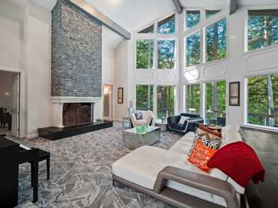 Step inside to a stunning open family room featuring soaring ceilings, a two-story decorative stone fireplace, and cozy seating that overlooks the private deck and backyard. There is a dining space for up to 6 in this room as well. Off of the family room is a large office with a spiral staircase leading to a charming observatory, a hidden gem with panoramic views and a cozy nook ideal for reading or unwinding. The gourmet kitchen is a chef’s dream with a large island, double ovens, bar area with wine and beer fridges, and plenty of counter space for preparing and sharing meals. A dining area for six sits adjacent to the kitchen, and there are two convenient half baths on this level. The main-floor master suite offers a true retreat, complete with a king-size bed, spa-inspired bathroom, walk-in steam shower, and soaking tub. Sliding doors open directly to the deck, where you can enjoy your morning coffee surrounded by peaceful wooded views. On the lower level you'll find the indoor heated pool, complete with depths of up to 10 feet. Nearby, you’ll find a sauna, a full bathroom with walk-in shower, and a home movie theater with seating for nine. The walk-out basement includes a bar room with seating around a brick fireplace, creating a cozy space for entertaining. You’ll also find a dedicated workout area, and access to a large patio that opens onto the private backyard. Up above, the spacious deck offers additional seating and wooded views — ideal for relaxing or simply enjoying the peace of nature. The hearth room/family room provides an intimate seating area with another decorative fireplace with a TV above — perfect for morning coffee or quiet conversation.
