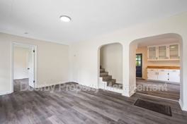 Step inside to a welcoming living room. Off to the left is the primary suite, which is massive in size and includes four closets along with a modern ensuite bathroom. The living room flows into the kitchen, where you’ll find sleek white cabinets, butcher block countertops, and appliances including a fridge and range. The kitchen also opens to the backyard, making it easy to enjoy indoor and outdoor living.
