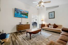 The interior of the house features a single-level floor plan with expansive room spaces and hardwood floors. A vast living room includes a Roku smart TV. The huge, fully stocked kitchen is equipped to cater to your needs. The house has a vast front yard with plenty of space for parking 2 to 3 cars and a large backyard for any outdoor activities.