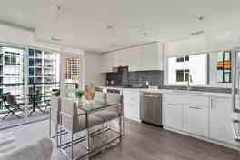 Don't miss this South-East corner PENTHOUSE at the QUARTET! Fall in love with the beautiful chef's kitchen with high-end JENN-AIR stainless steel appliances, gas stove and 36" fridge! The unit features wood flooring throughout, a large balcony overlooking the garden, and a 608 sq ft private ROOF TOP PATIO! Enjoy BBQ's and host family gatherings with no shortage of space to entertain! This 2 bedroom + FLEX space has a great functional layout, modern finishings, and a gorgeous bathroom (with heated floors). It's complete with a smart home package, Nest thermostat and AC. The complex has a 14,000 sq ft clubhouse, POOL, STEAM ROOM/SAUNA, FULL GYM, SQUASH AND BASKETBALL COURT. 1 parking, 1 Storage is included with the rental.