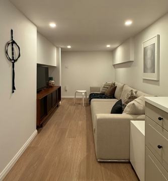 The suite is in the basement of a home and boasts varying ceiling heights, ranging from 6'5" to 6'8". As this is a basement unit, you may occasionally hear sounds from the main floor above. The central heating and cooling system is managed from the main floor. The exterior of the home is currently undergoing renovations, and the entrance area may appear unfinished.