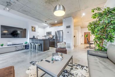 Chic urban loft in the heart of downtown Toronto, boasting soaring ceilings and an open concept layout. This spacious 680 sq ft apartment, complemented by a 100 sq ft terrace, is located at Adelaide and Spadina, right next to the entertainment district. With a high walk score, it is just steps away from the city’s best cafes, restaurants, grocery stores, bars, nightlife, and public transportation.