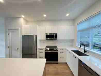 Discover modern living in this corner townhome at Wood & Water, nestled in the vibrant Fleetwood neighborhood's Wood & Water community by Anthem Properties—offering 1,500 sq ft of light-filled space with 3 generous bedrooms, a versatile den/flex room (ideal for a home office, playroom, or guest space), and 2.5 contemporary bathrooms, perfect for families, professionals, or shared living up to 5 occupants. Enjoy an open-concept layout boasting 9-foot ceilings, plush carpeting, large windows, a gourmet kitchen with stainless steel appliances (dishwasher, fridge, microwave, oven, and stovetop), a main floor powder room, full upstairs bathroom with bathtub, ensuite for privacy, cozy living and dining areas flowing to a private patio, in-suite laundry with washer and dryer, window coverings, and a secure 2-car side-by-side garage with additional street parking. Residents revel in exclusive amenities like a state-of-the-art fitness center, multi-purpose and games rooms, private theatre and fireside lounge, outdoor BBQ terrace, mini-golf course, clubhouse, on-site daycare, lush green spaces, walking trails, a serene creek, professional snow removal, and garbage collection for hassle-free living. Conveniently at the corner of 155th Street and Sitka Drive, it's minutes from top-rated schools, Strawberry Hill shopping, Hwy 99 for easy commutes to Vancouver or Langley, Fleetwood Golf Course, nature trails and parks, bus routes, and everyday essentials.